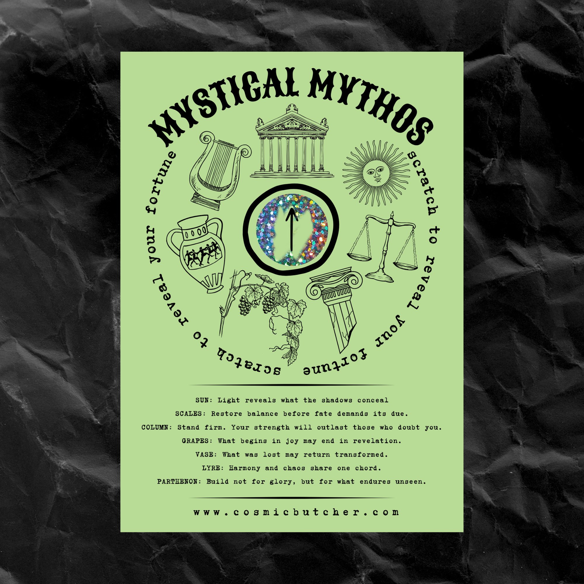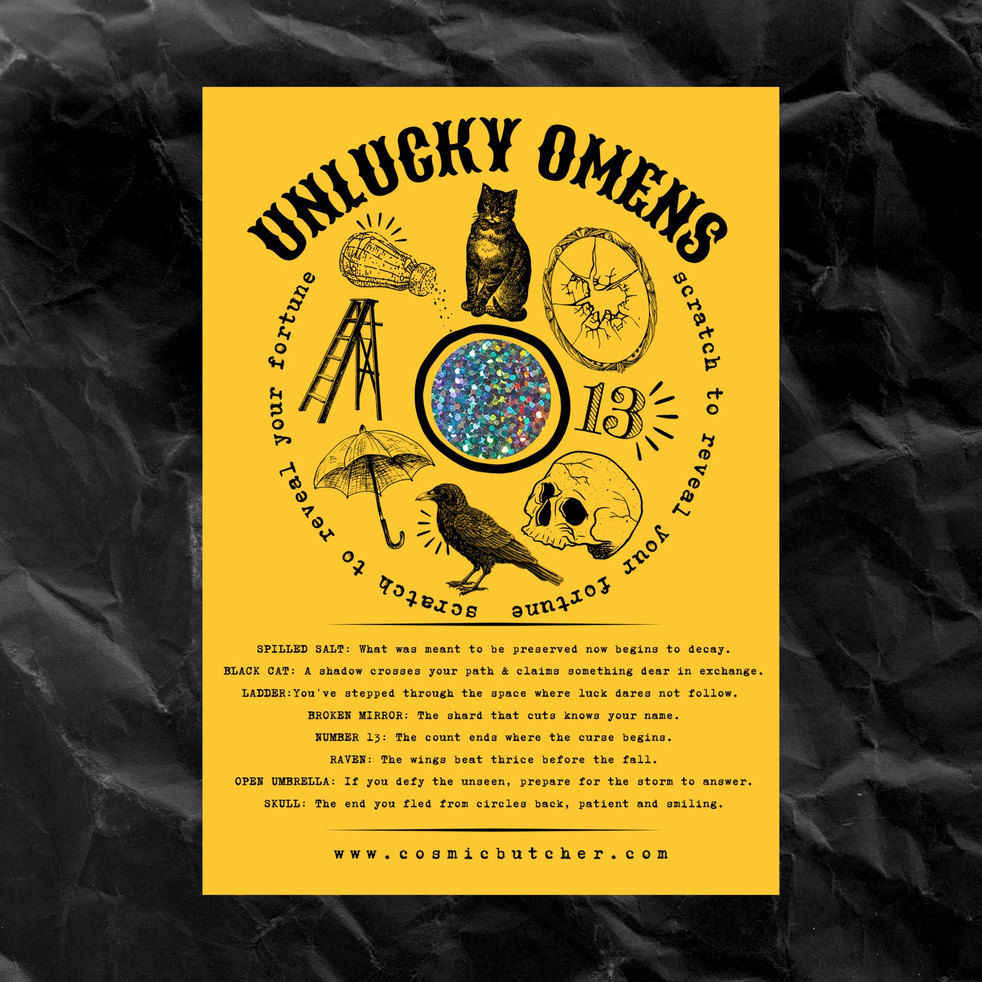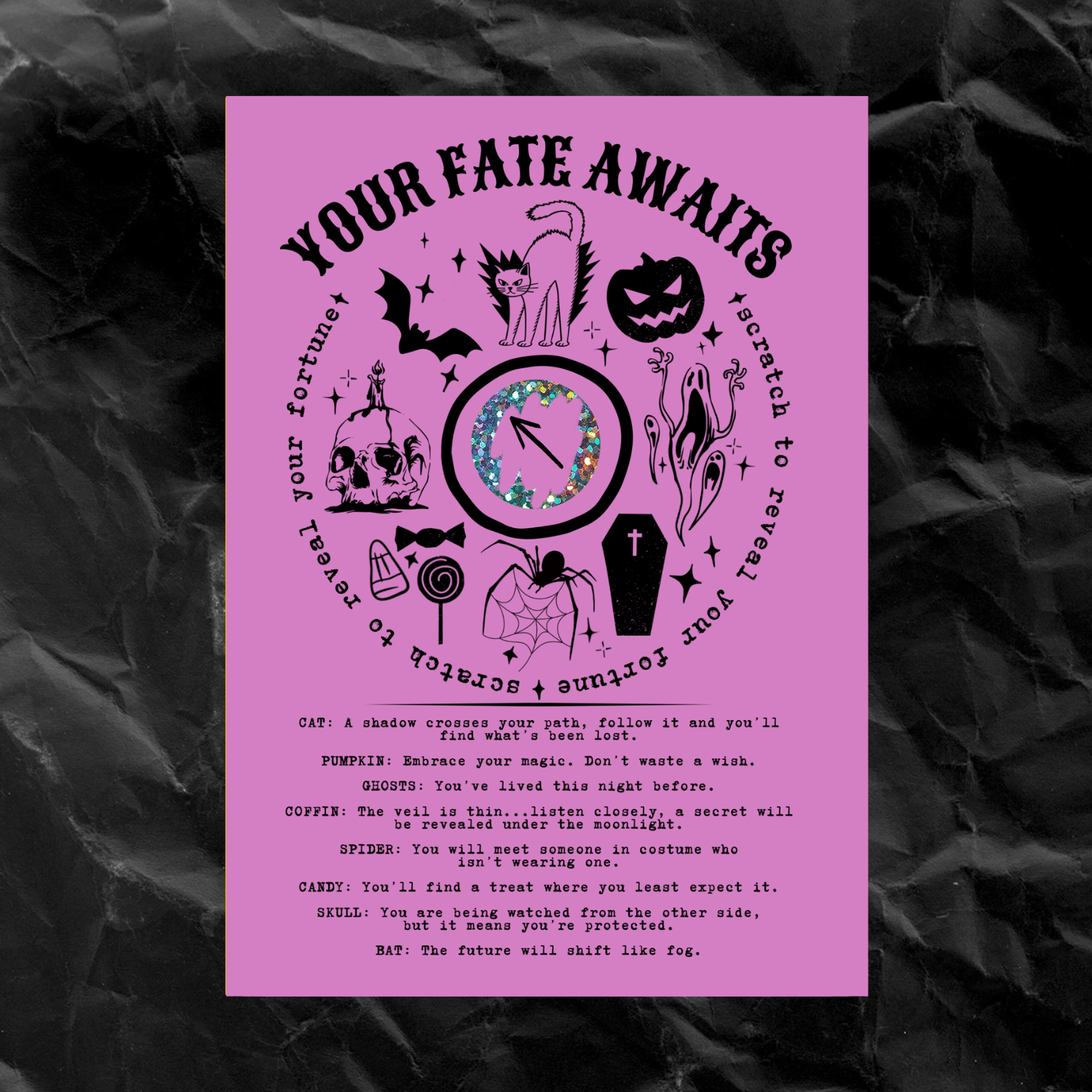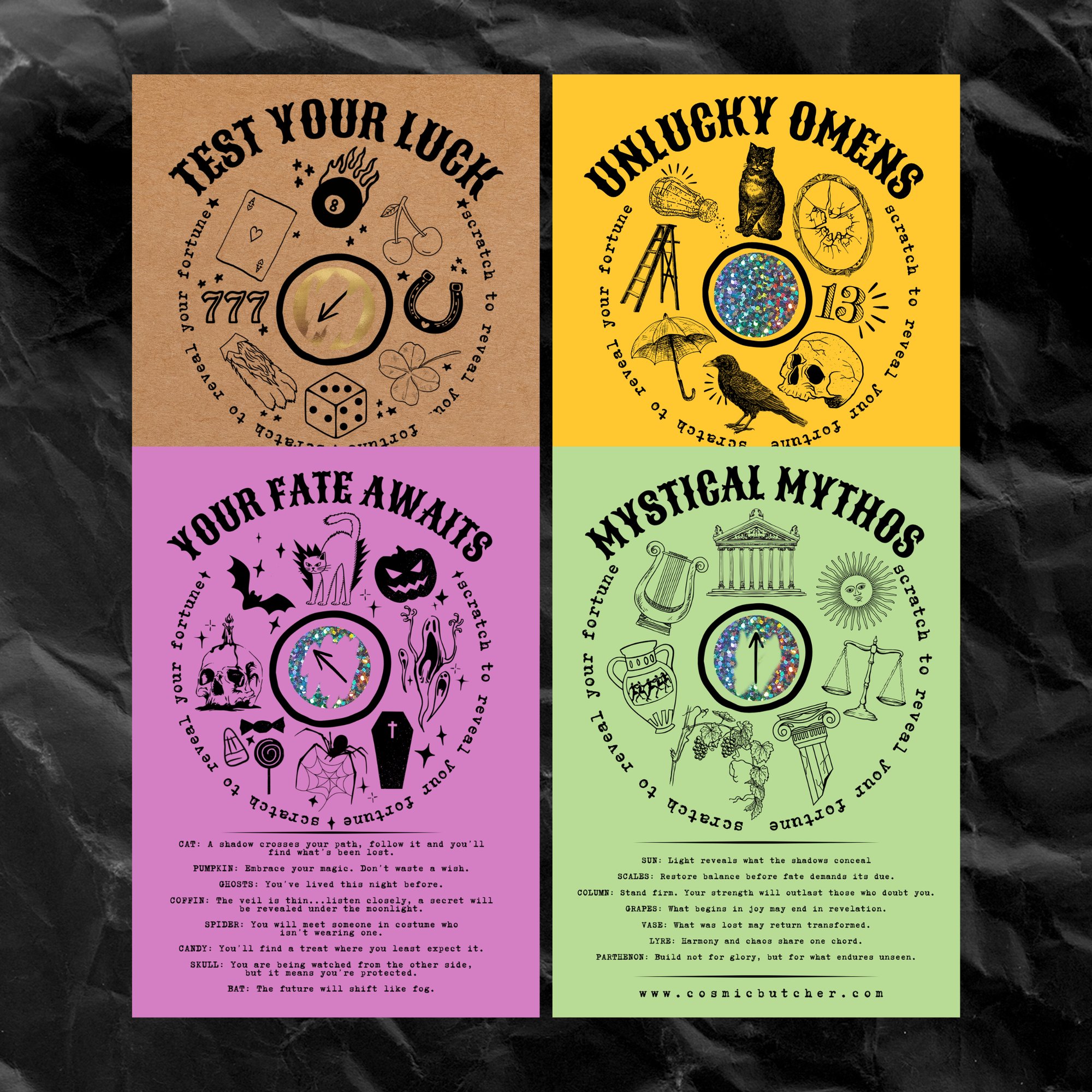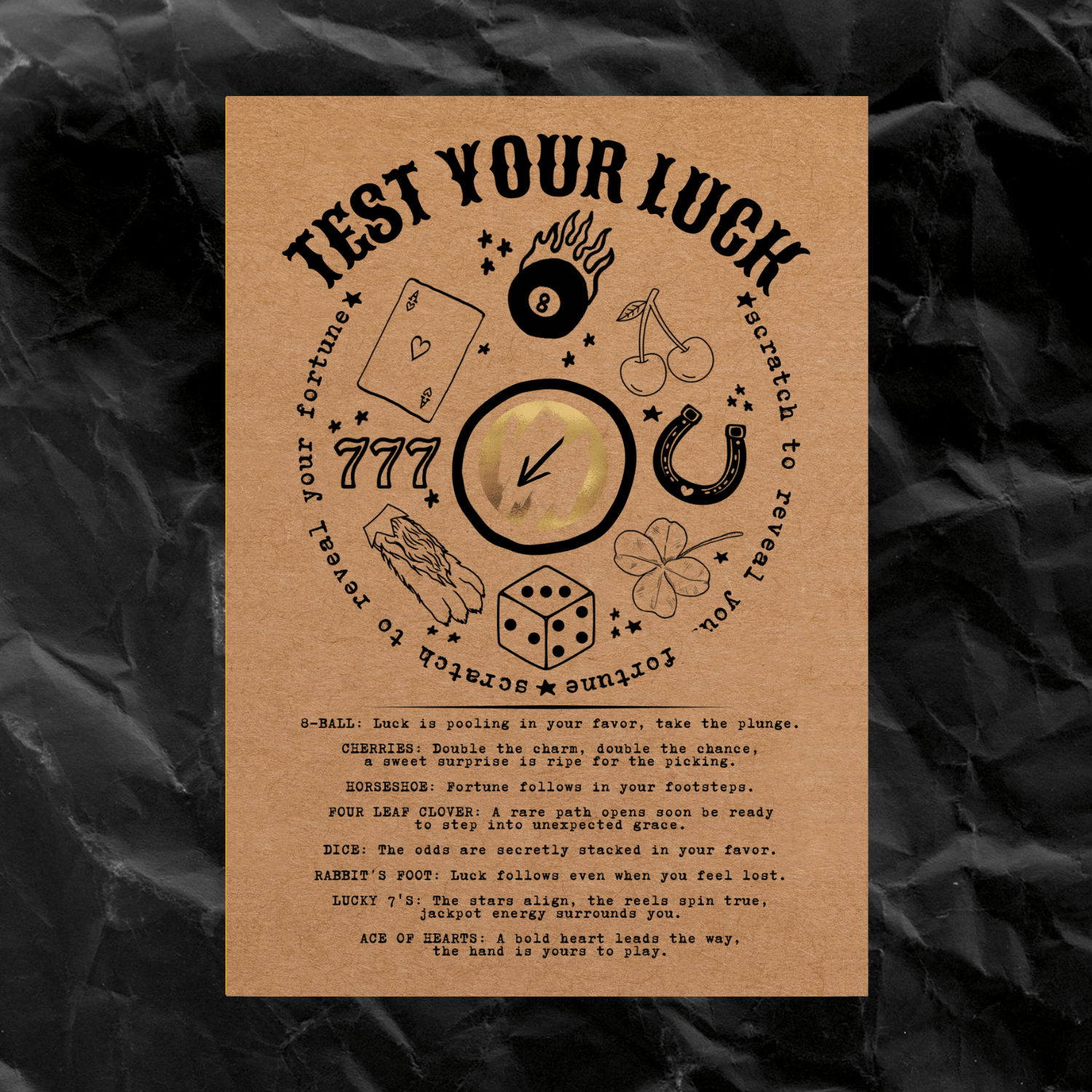 ✶ A 5”x7”, scratch-off card that doubles as a mini-art print featuring different symbols as possible outcomes. Treat this like a lottery ticket, grab a coin or use your fingernail and scratch the sticker to reveal your mystery fortune.